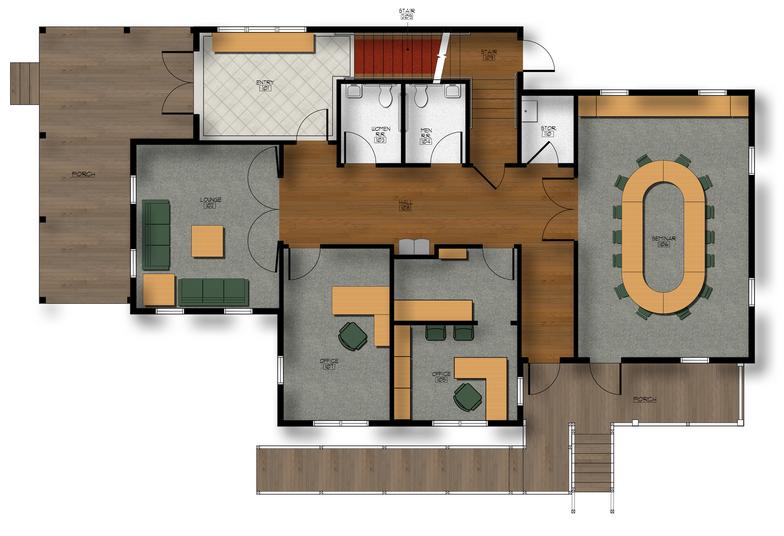Sometimes a full 3D model is just not needed. In certain instances we will simply take our CAD floor plans, site plans and/or elevations and add color and shading to them to give the illusion of a 3D rendering. We have used this method in several ways over the years. Sometimes it just helps a client in choosing materials and colors of finishes. Sometimes a quick rendering needs to be done for a meeting or for some type of display. This method of rendering is a quick and easy alternative to a full 3D rendering.